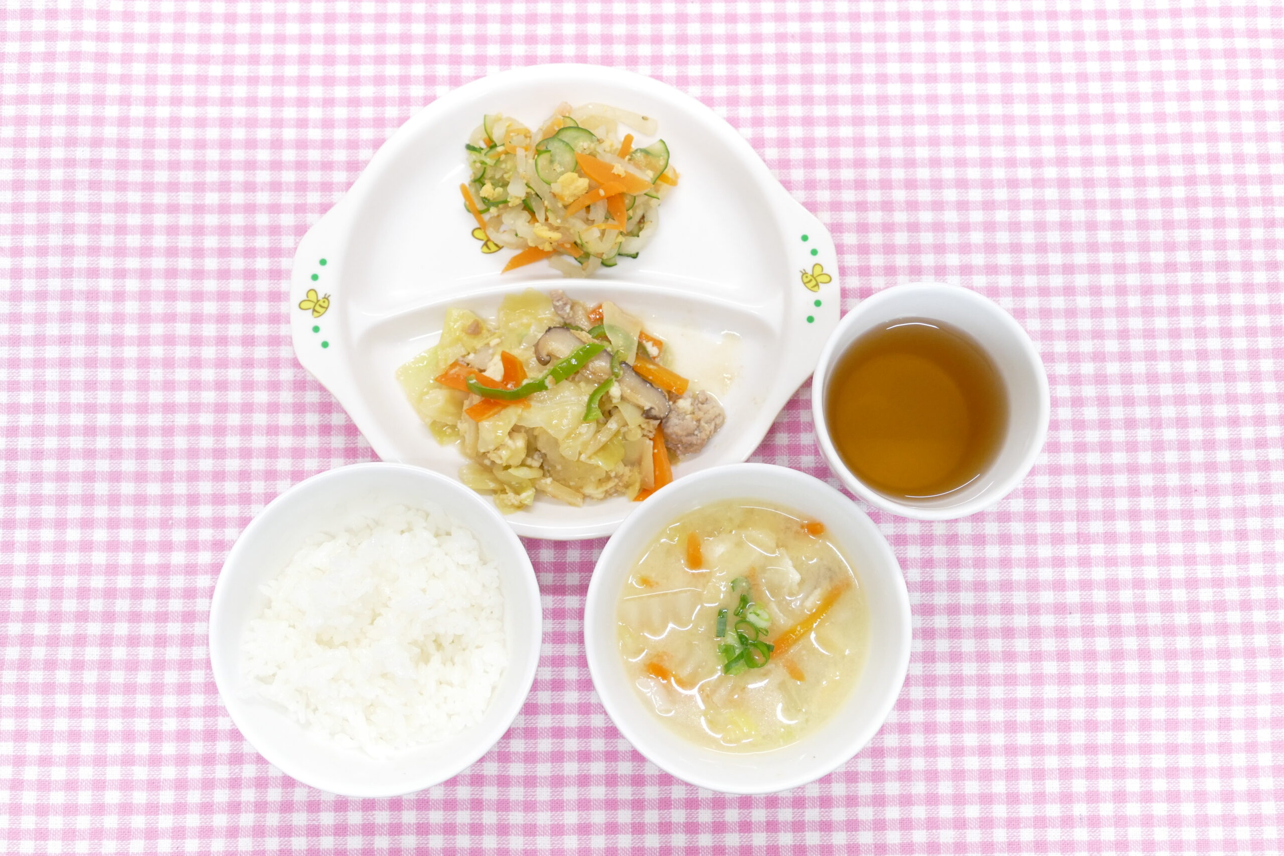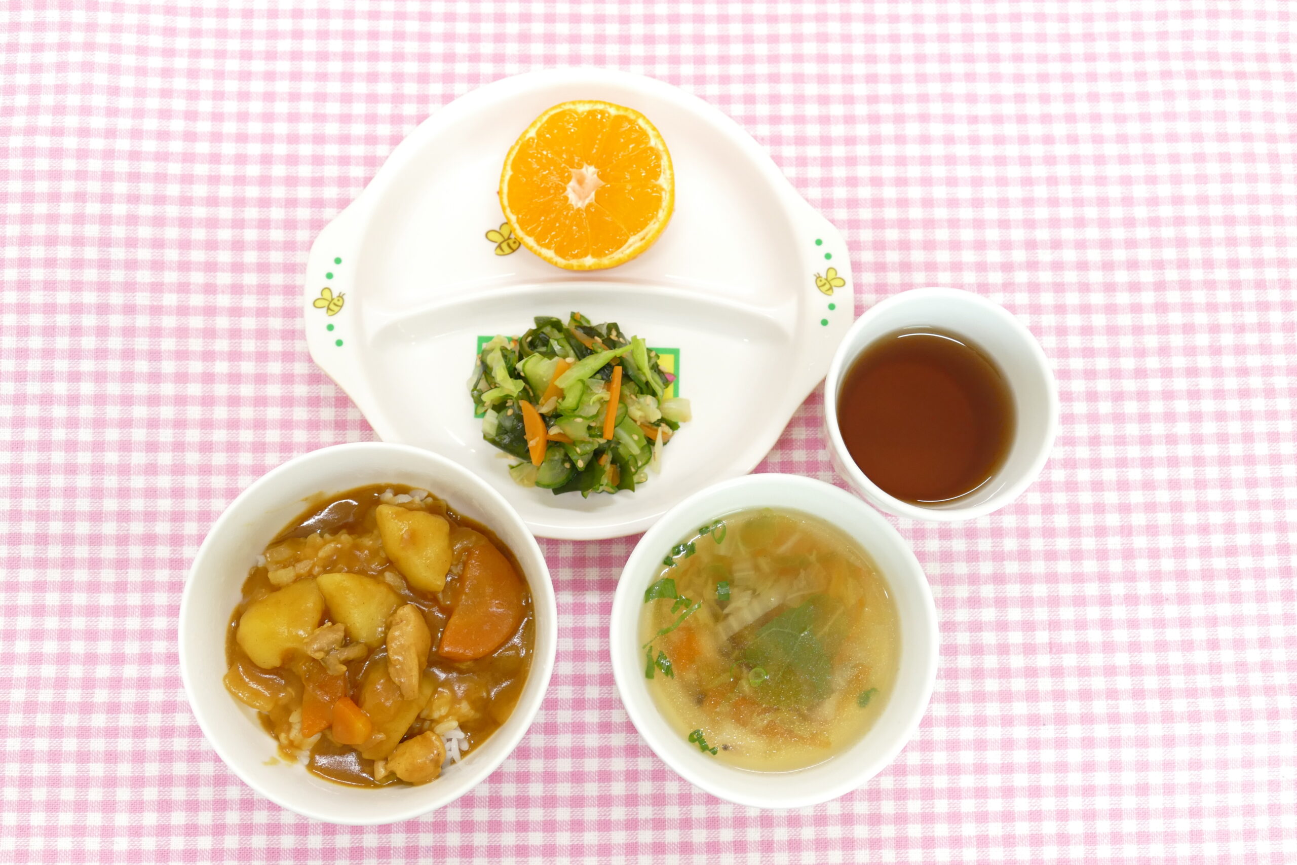 ≪お昼ごはん≫ チキンカレーライス わかめのごま酢和え 白菜としめじのスープ フルーツ(みかん) ≪おやつ≫ ホットケーキ 牛乳