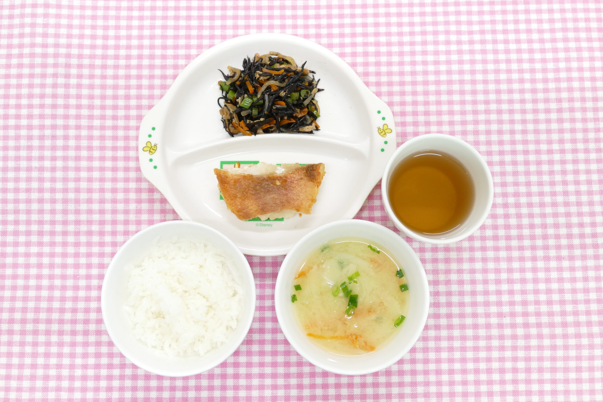 ≪お昼ごはん≫ 魚のムニエル 五目ひじき煮 野菜のみそ汁 ごはん ≪おやつ≫ 紅芋のスイートポテト 牛乳