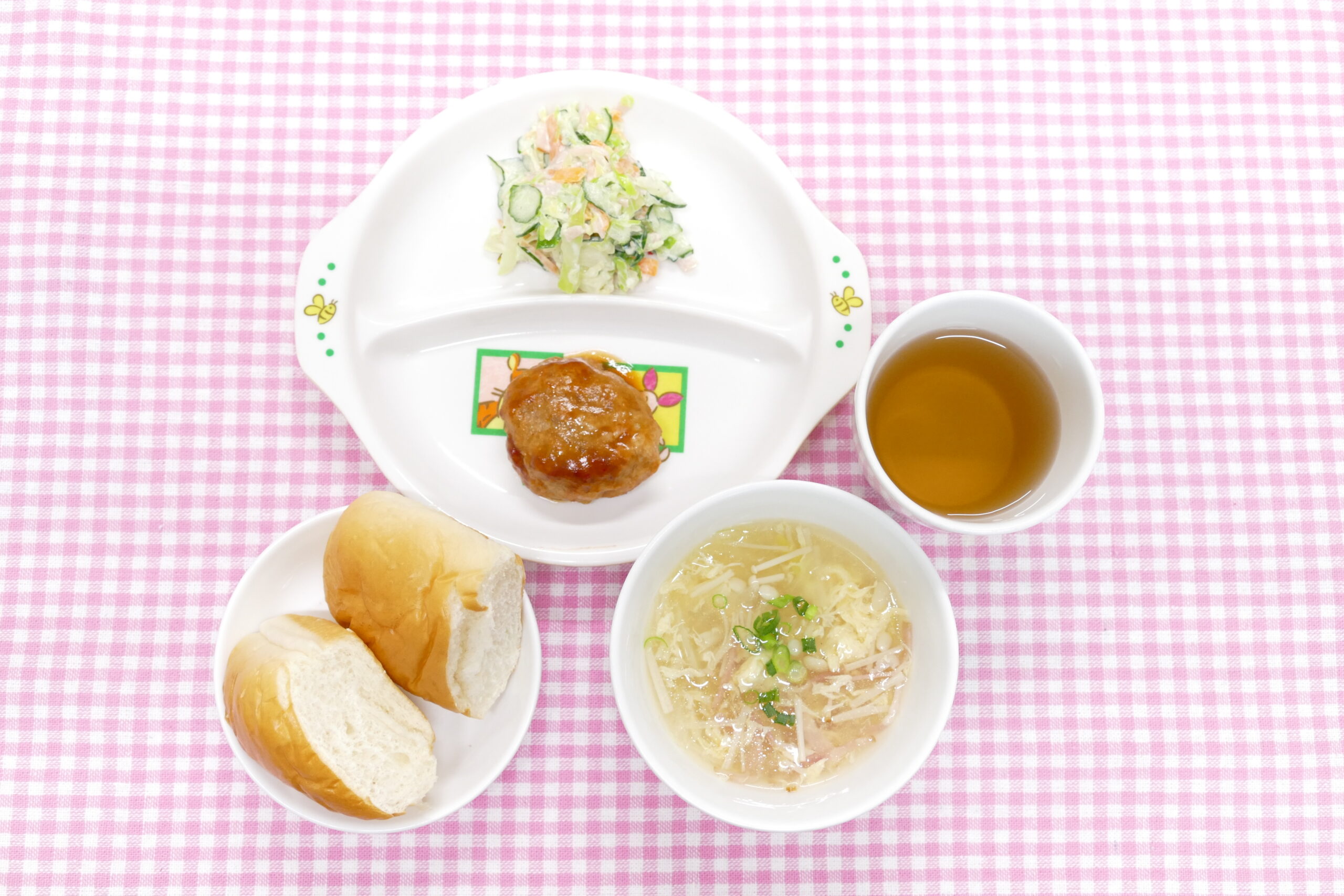 ≪お昼ごはん≫ 煮込みハンバーグ 野菜サラダ 卵とベーコンのスープ ロールパン ≪おやつ≫ フルーツヨーグルト 牛乳