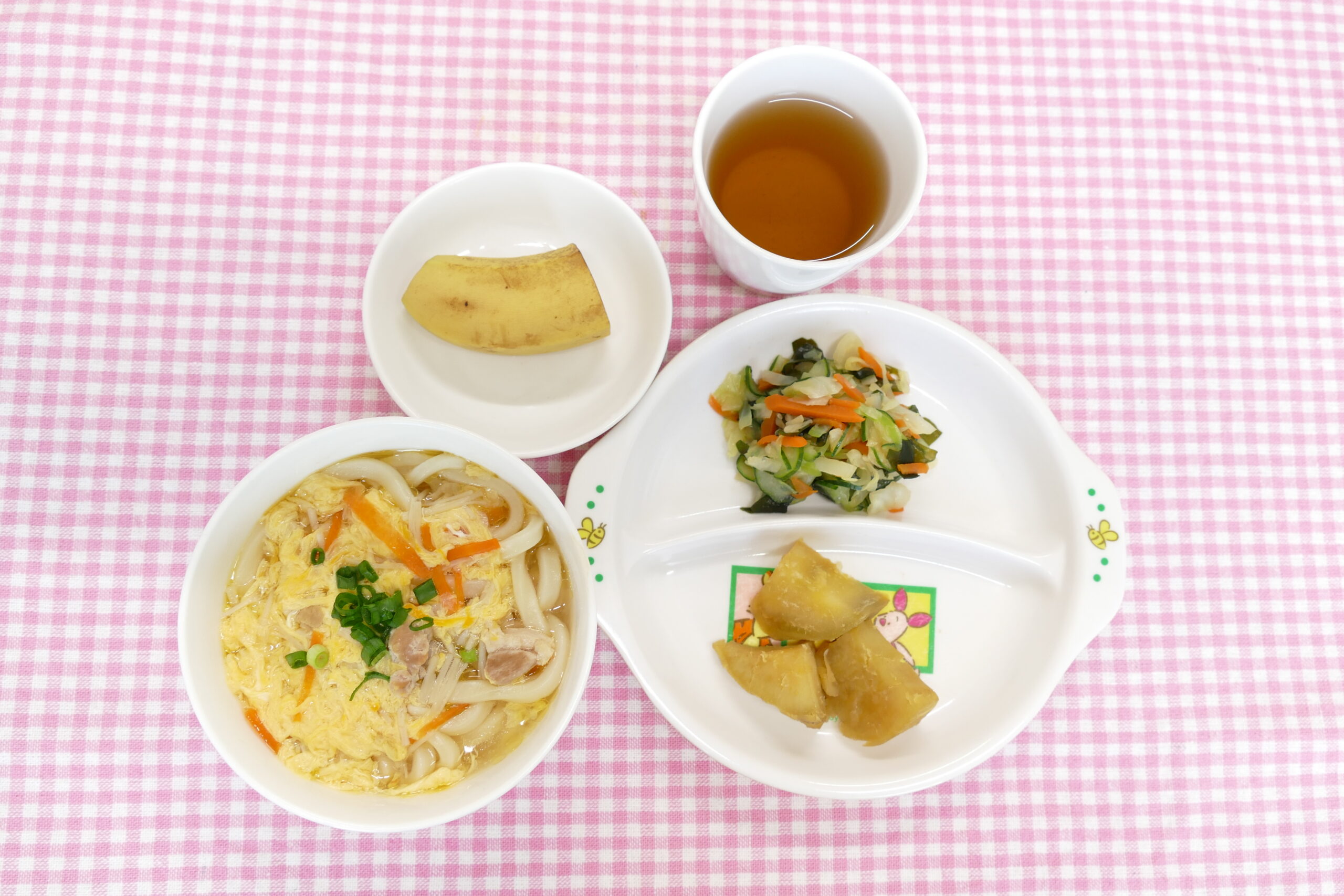 ≪お昼ごはん≫ かきたまうどん きゃべつの中華和え さつま芋の甘煮 フルーツ(バナナ) ≪おやつ≫ きな粉トースト 牛乳
