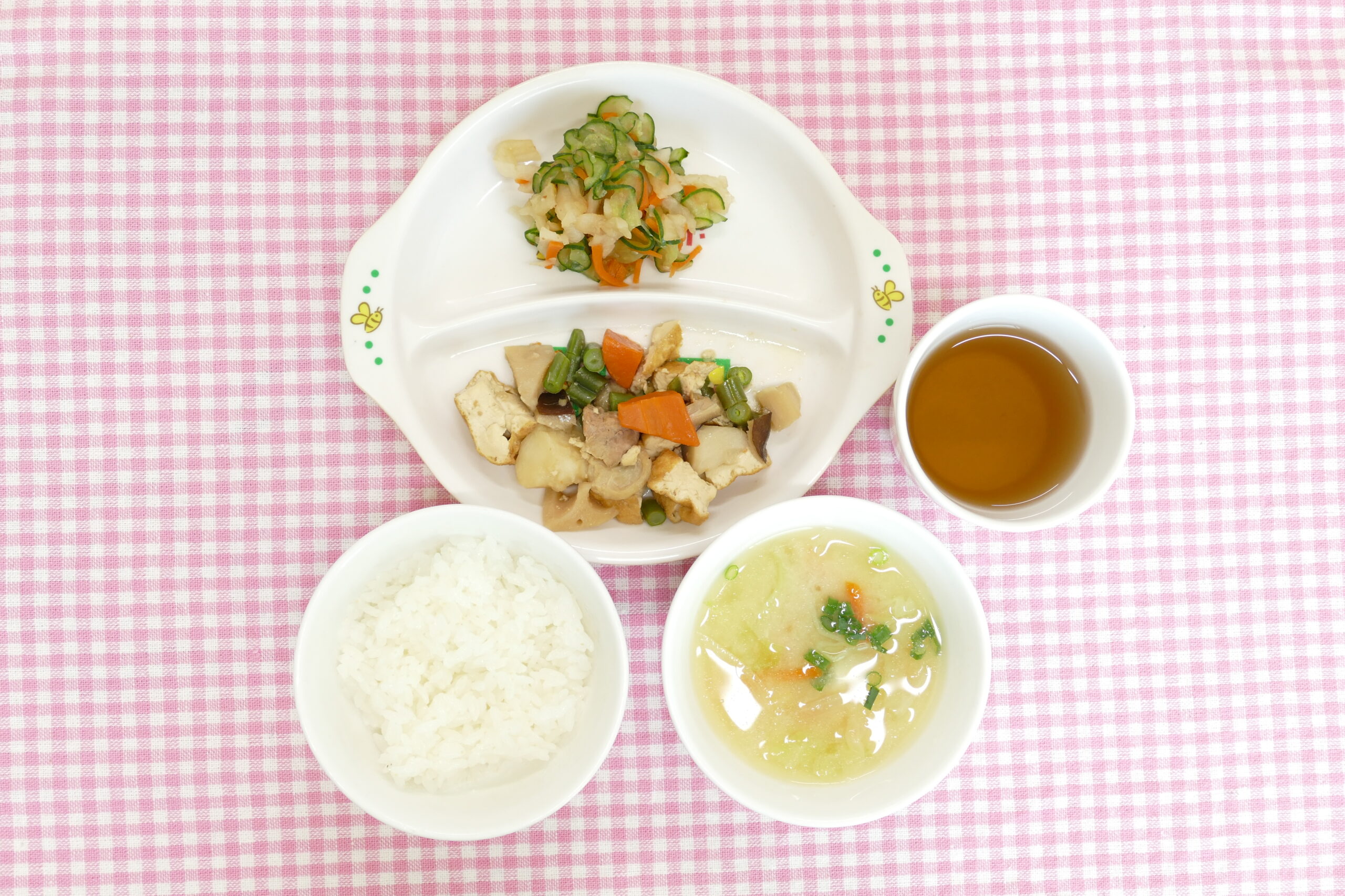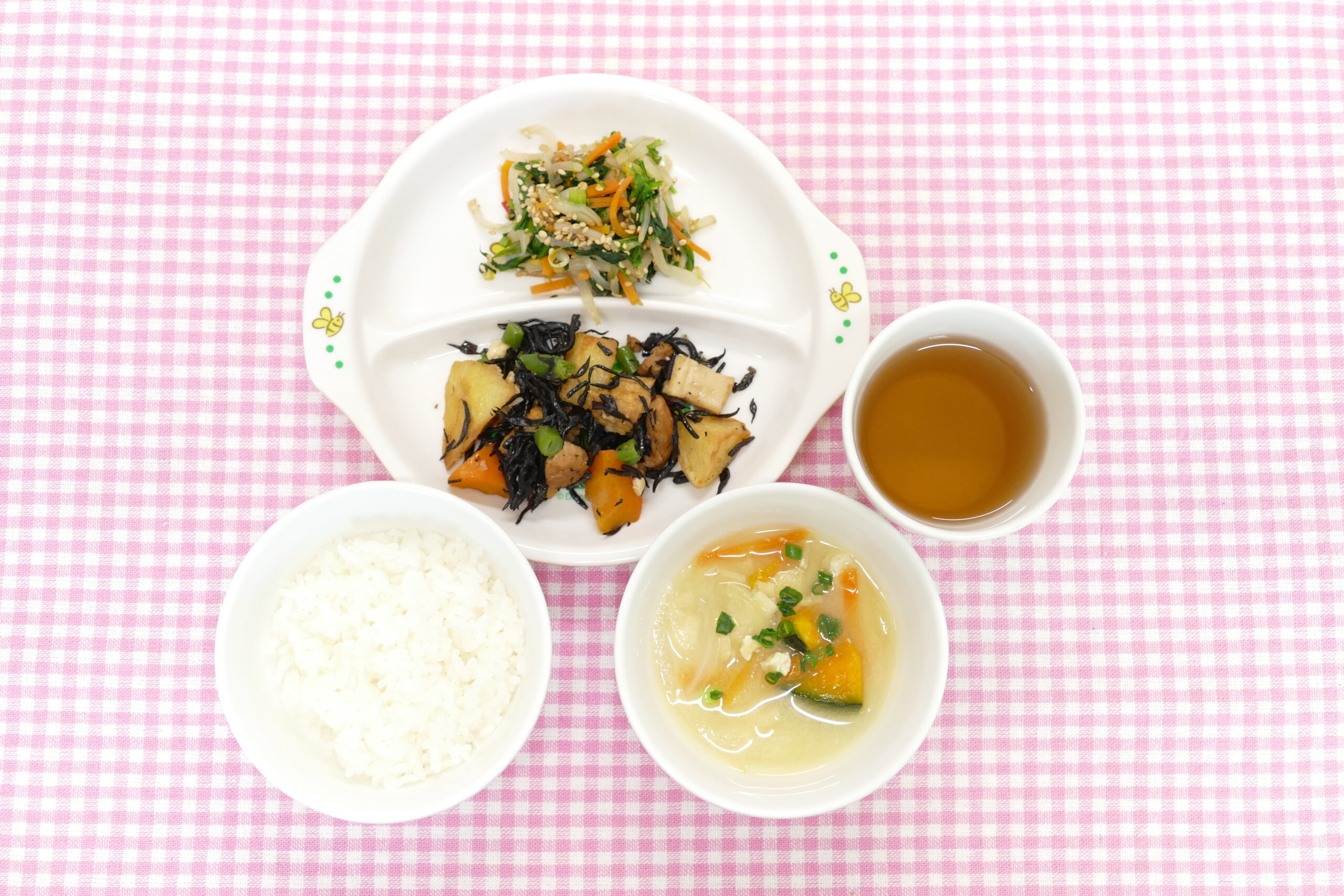 ≪お昼ごはん≫ ひじきと揚げじゃが芋煮 五目和え かぼちゃのみそ汁 ごはん ≪おやつ≫ ザクザククッキー 牛乳