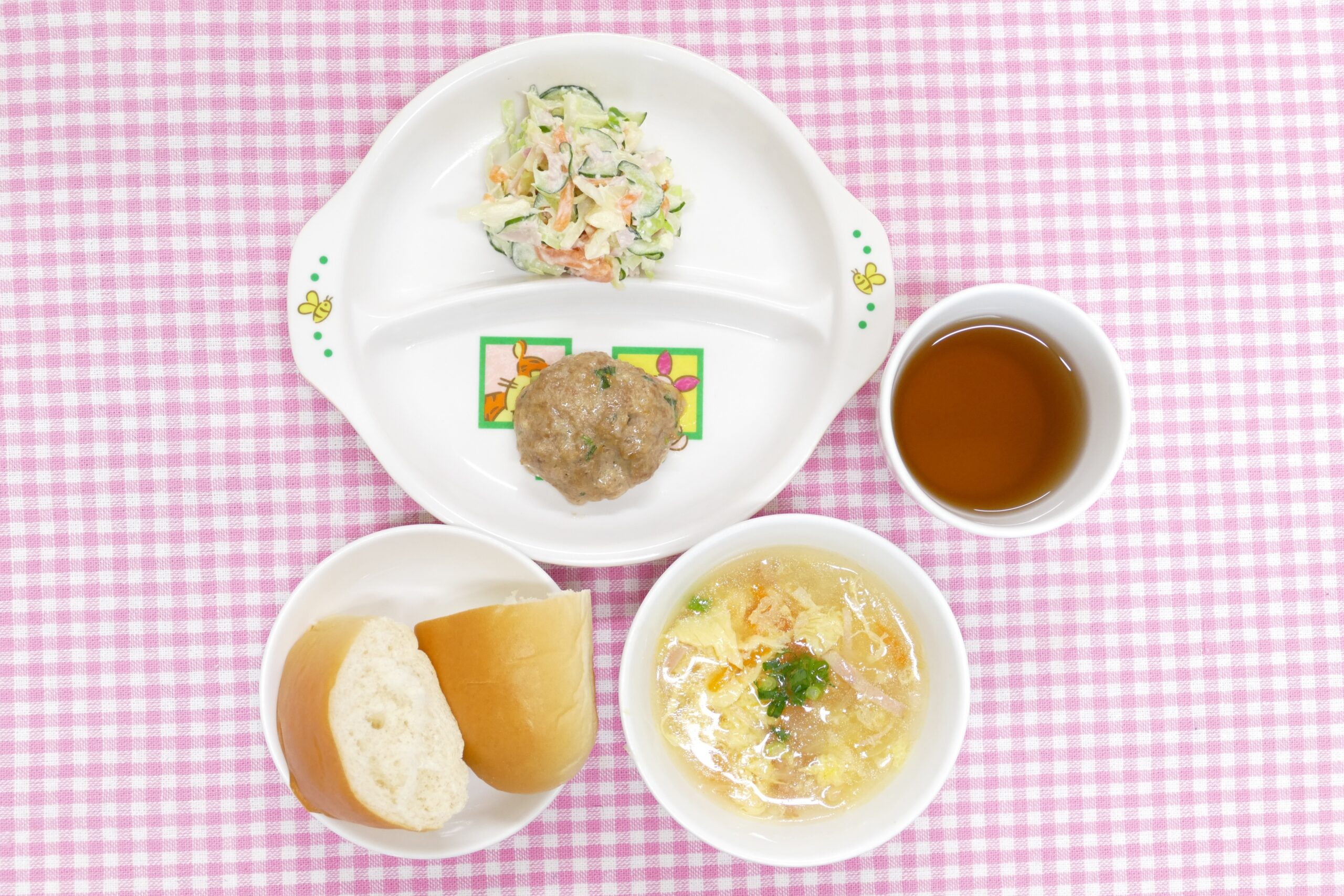 ≪お昼ごはん≫ もやしたっぷりハンバーグ 野菜サラダ 卵とベーコンのスープ ロールパン ≪おやつ≫ フルーツヨーグルト 牛乳