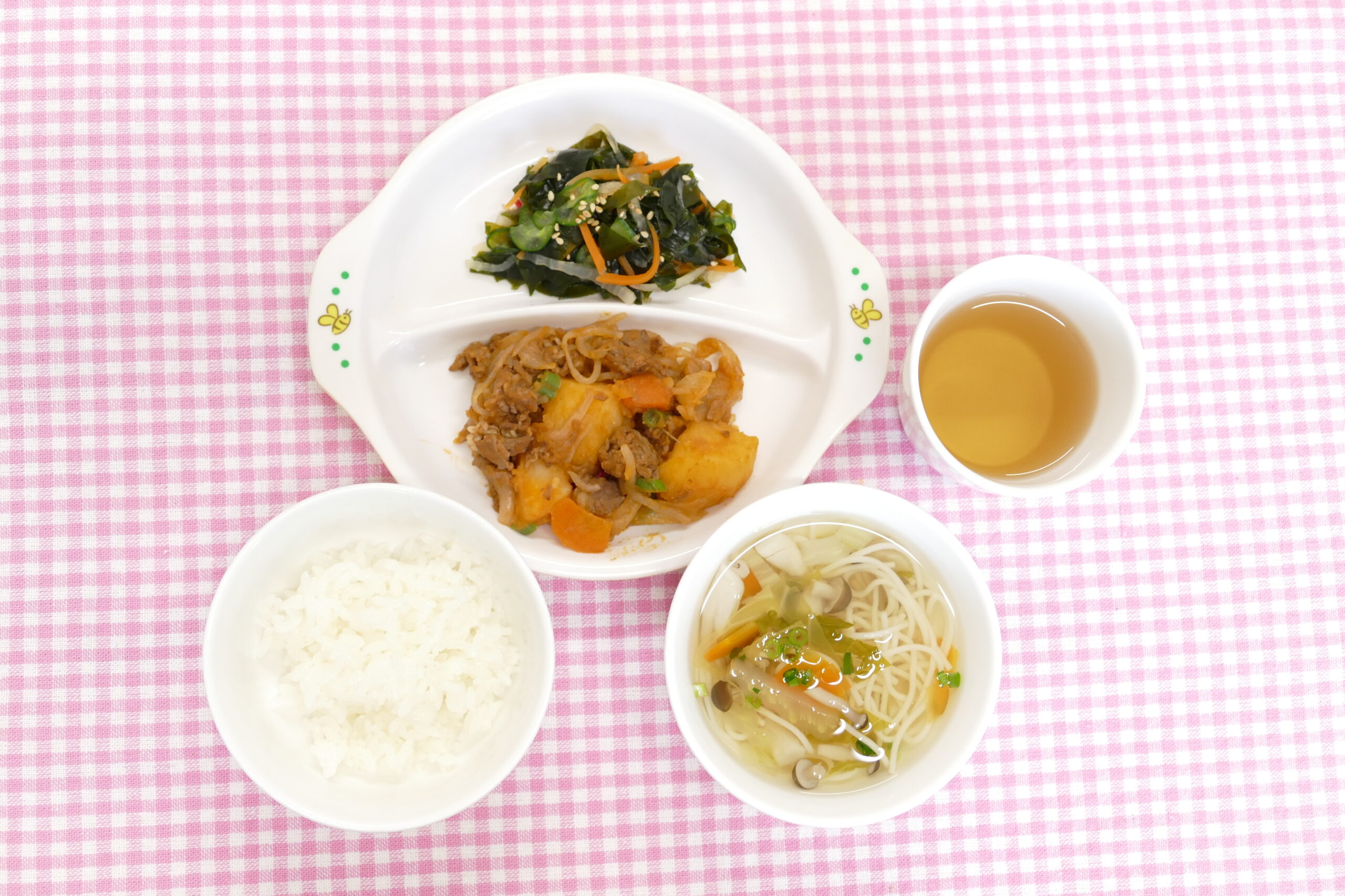 ≪お昼ごはん≫ 洋風肉じゃが わかめの酢の物 そうめん汁 ごはん ≪おやつ≫ フレンチトースト 牛乳