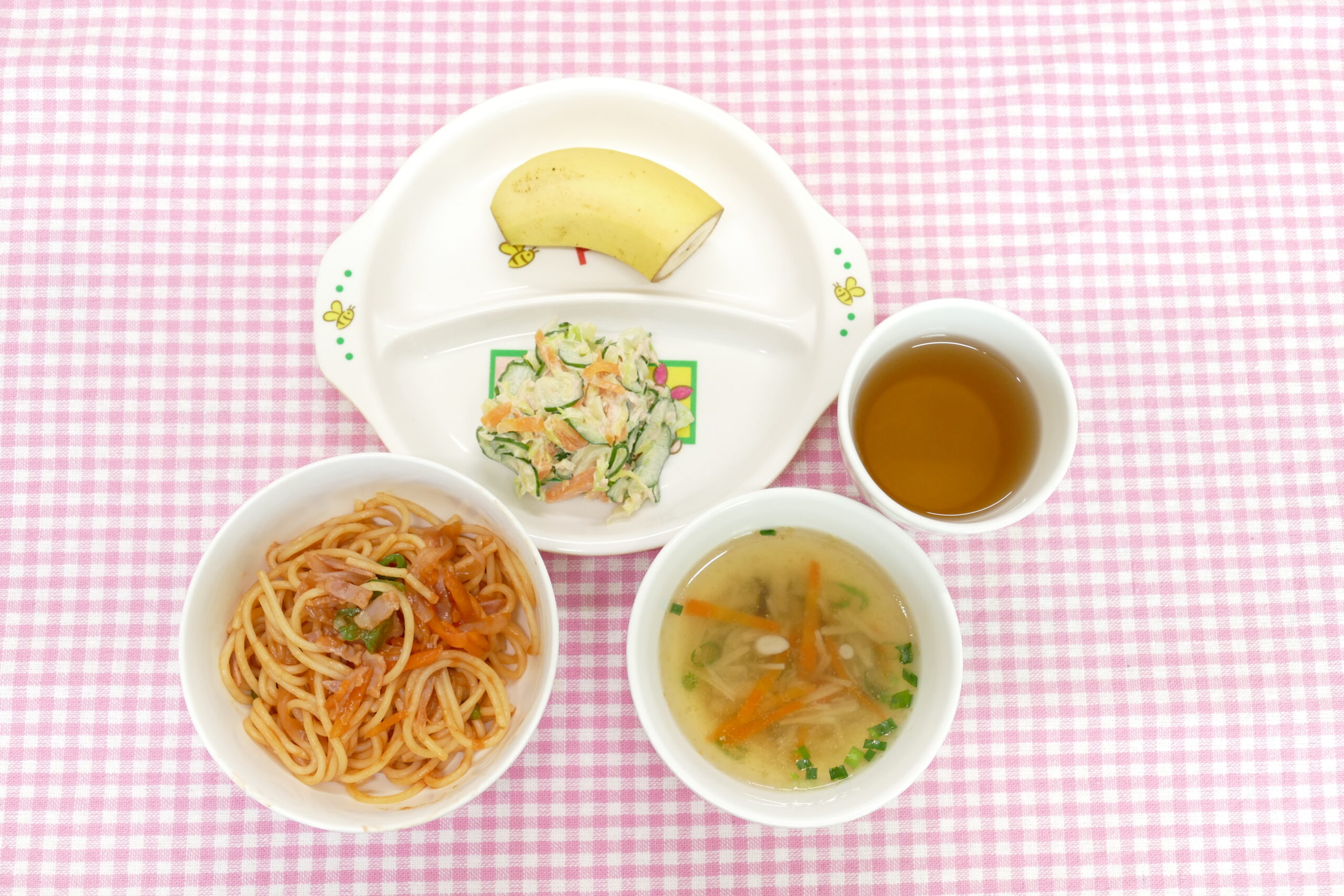 ≪お昼ごはん≫ スパゲティナポリタン ツナときゃべつのサラダ きのこスープ フルーツ(バナナ) ≪おやつ≫ 中華ごはん 牛乳