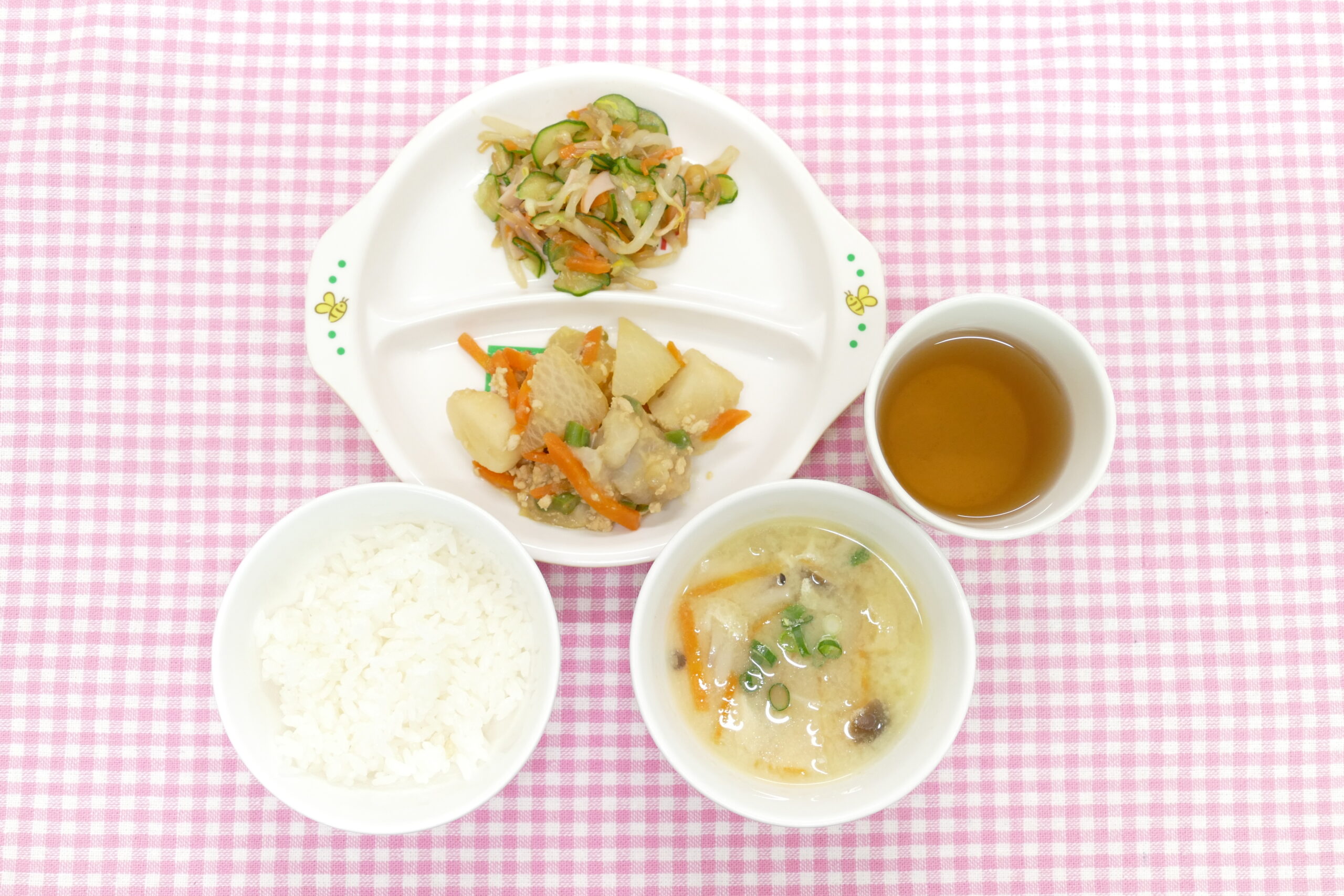 ≪お昼ごはん≫ 大根と里芋のそぼろ煮 きゅうりの中華風サラダ 切干大根のみそ汁 ごはん ≪おやつ≫ 梅が枝風焼き餅 牛乳