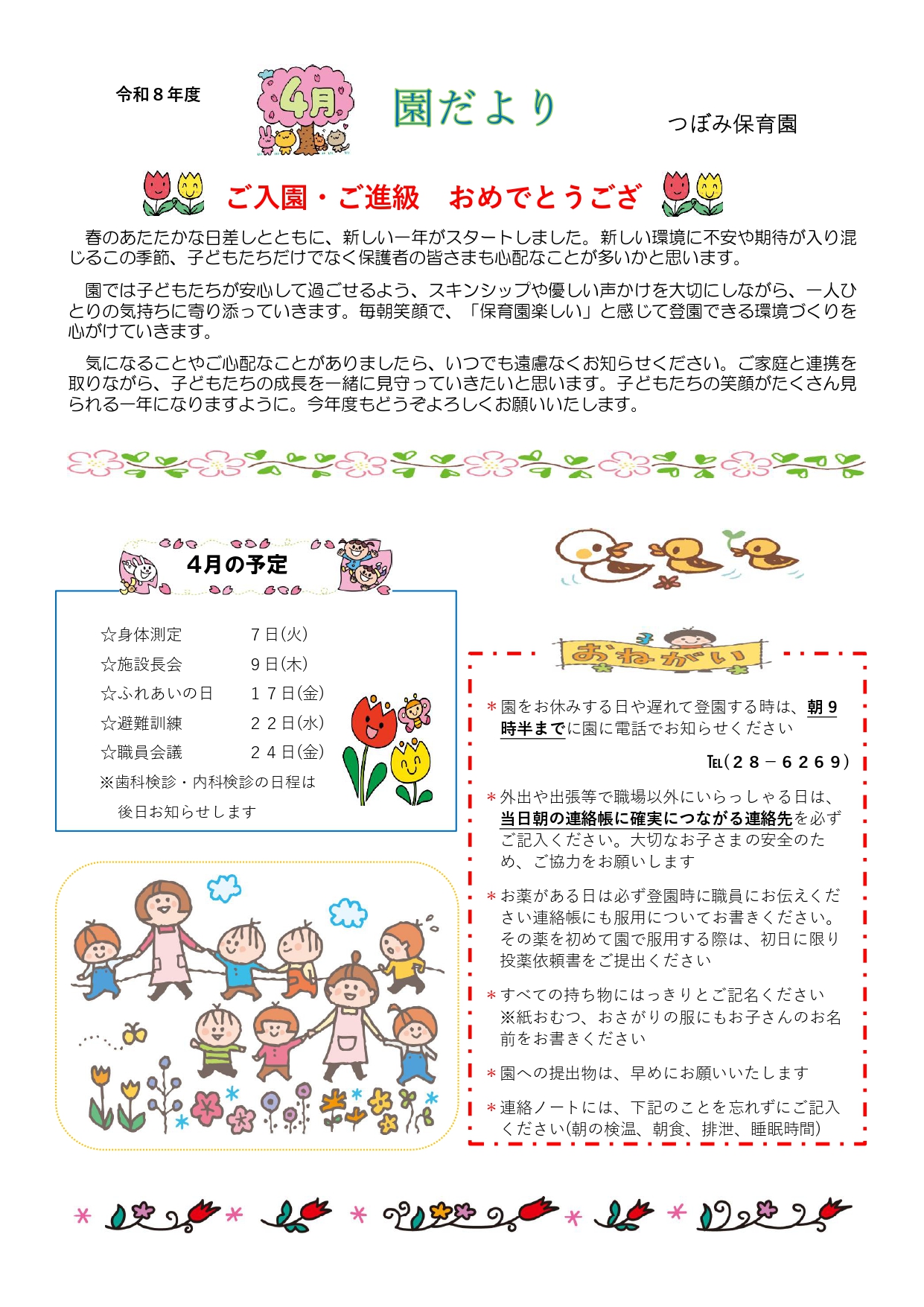 2026.3.30★卒園式 続きを見る 2026.3.11★さくらの製作/室内遊び 続きを見る 2026.3.3★ひな祭り・誕生会 続きを見る 2026.3.2★ミニ発表会・ちゅうりっぷ組 続きを見る