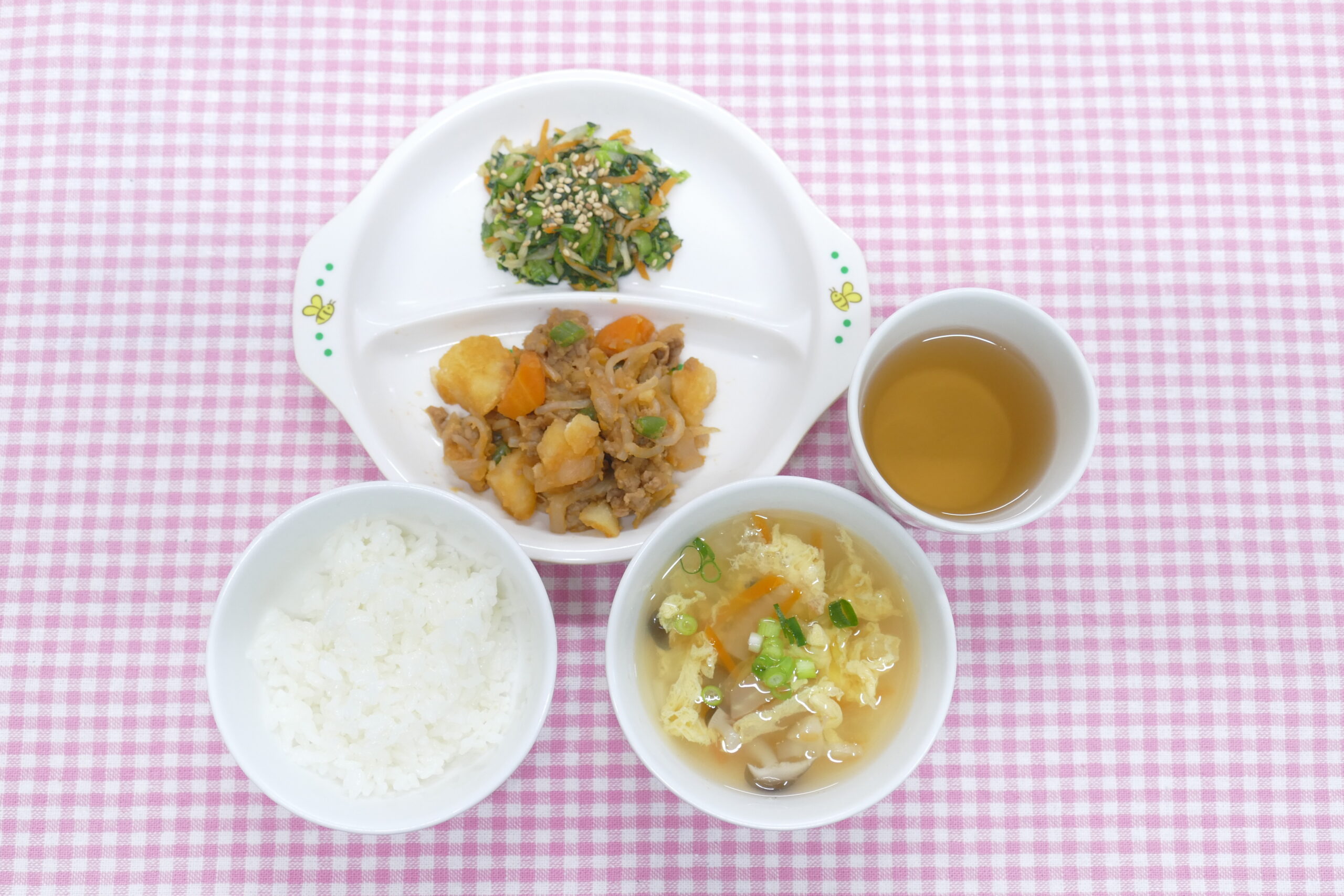 ≪お昼ごはん≫ 洋風肉じゃが 野菜のごま和え かきたま汁 ごはん ≪おやつ≫ やせうま 牛乳