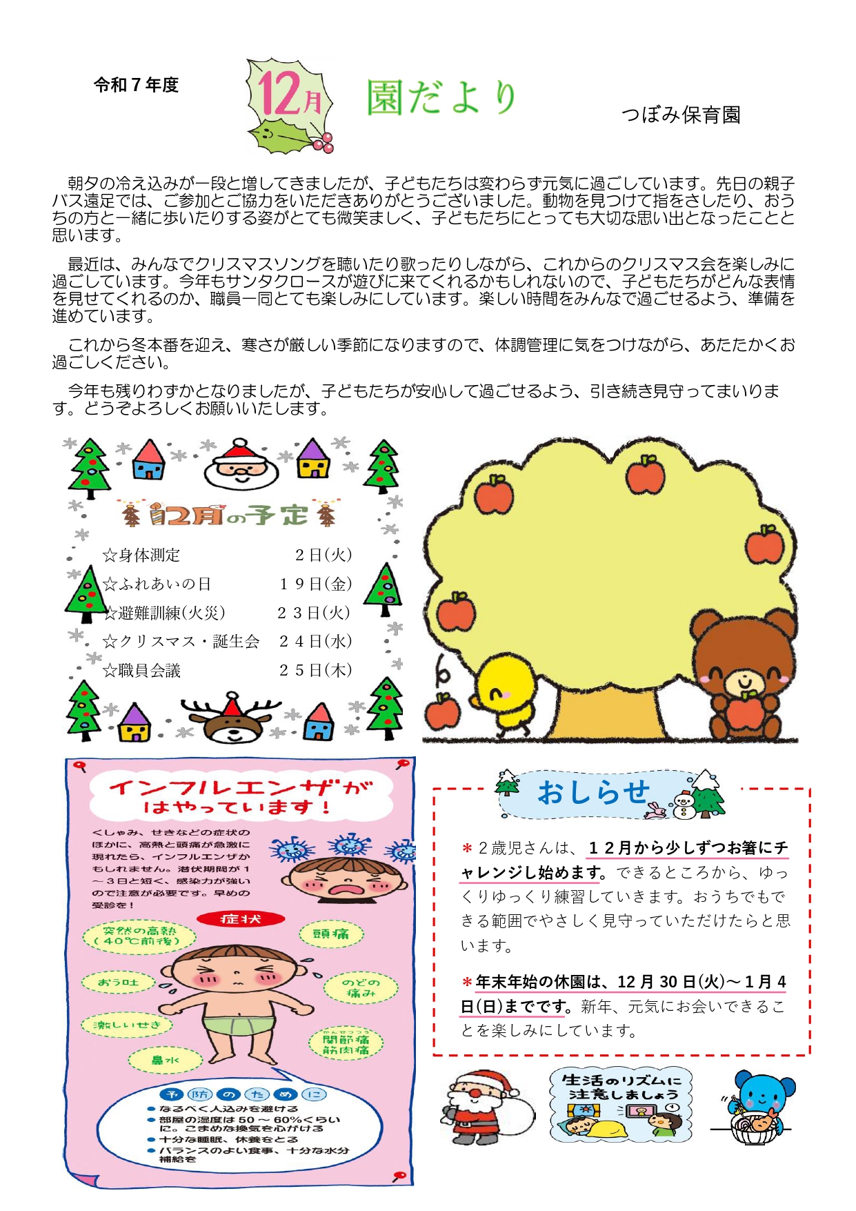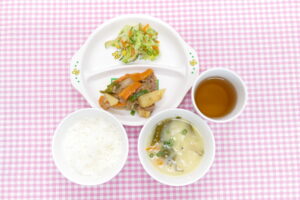2025.12.1 写真 ≪お昼ごはん≫ じゃが芋のチンジャオロース風煮 ドレッシングサラダ わかめと油揚げのみそ汁 ごはん ≪おやつ≫ マドレーヌ 牛乳 前の記事2025年12月園だより次の記事 2025.12.2★どんぐり拾い/室内遊び