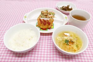 2026.1.20 写真 ≪お昼ごはん≫ 魚のフライ 納豆サラダ かきたま汁 昆布とかつお節のつくだ煮 ごはん ≪おやつ≫ チーズポテトもち 牛乳 前の記事2026.1.19 写真次の記事 2026.1.21 写真