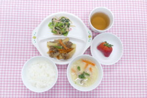 2026.4.20 写真 ≪お昼ごはん≫ じゃが芋のチンジャオロース風煮 ほうれん草の中華和え 大根のみそ汁 フルーツ(苺)※今日,園児達みんなで収穫した苺🍓です ごはん ≪おやつ≫ 桃パンケーキ 牛乳 前の記事2026.4.17 写真次の記事 2026.4.21 写真