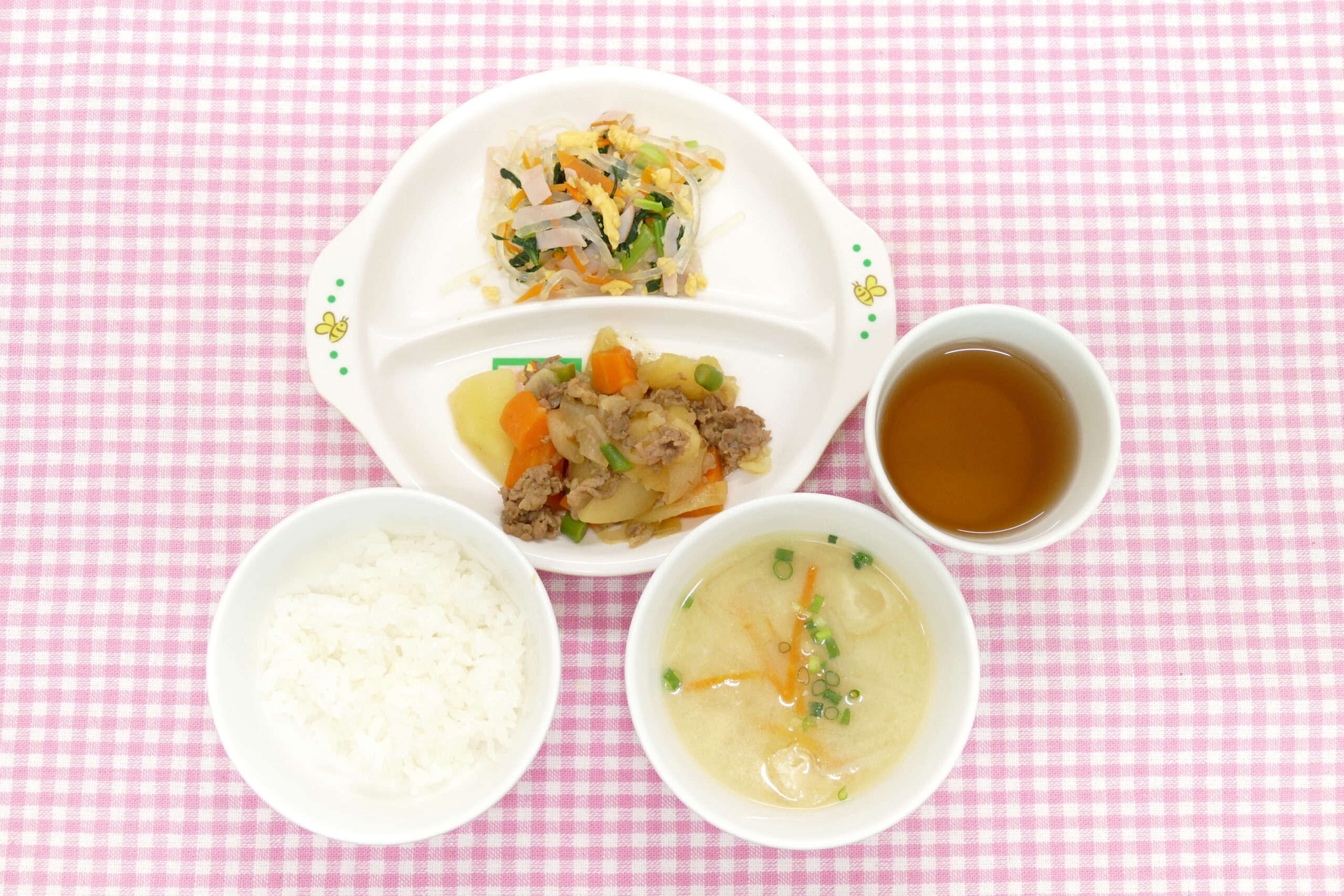 ≪お昼ごはん≫ カレー肉じゃが 錦和え 切干大根のみそ汁 ごはん ≪おやつ≫ ヨーグルトで作るチーズケーキ 牛乳