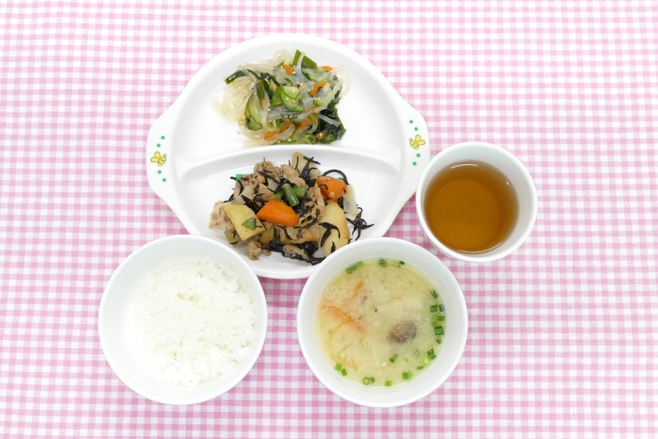 ≪お昼ごはん≫ じゃが芋とひじきの煮物 わかめと春雨の酢の物 きのこのみそ汁 ごはん ≪おやつ≫ プチクッキー 牛乳