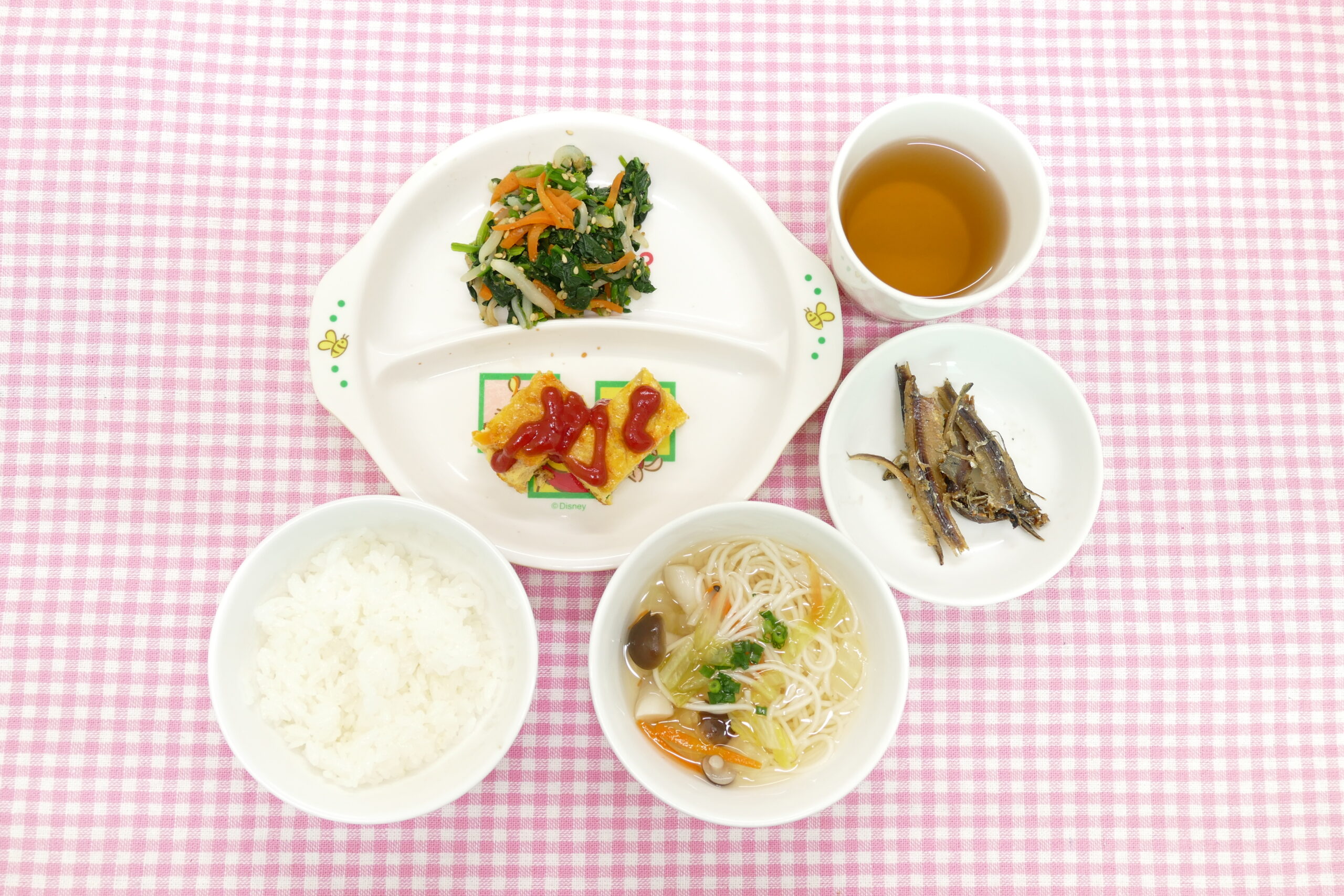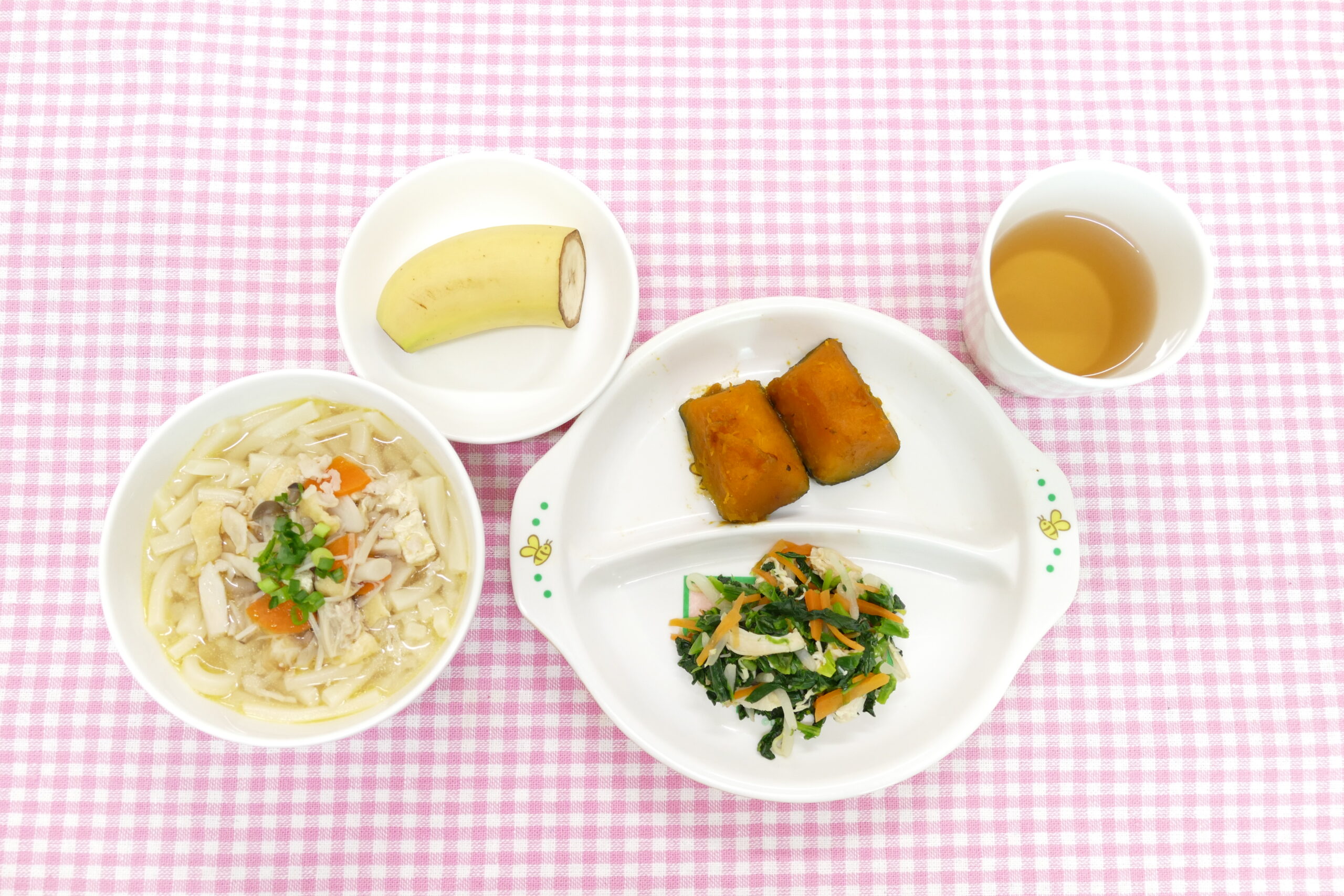 ≪お昼ごはん≫ きのこうどん ほうれん草とささ身の酢和え かぼちゃの甘煮 フルーツ(バナナ) ≪おやつ≫ わかめごはん 牛乳