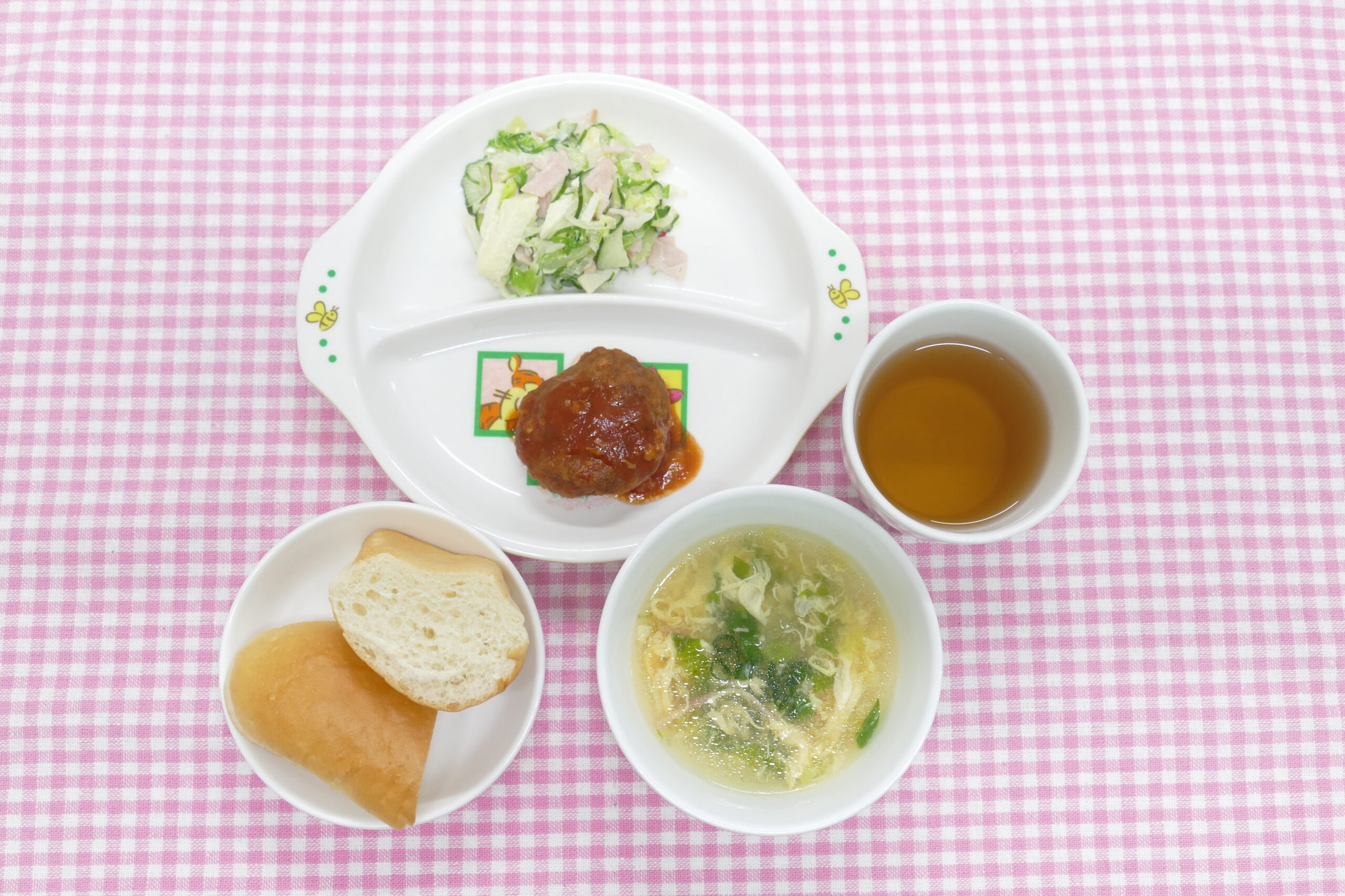 ≪お昼ごはん≫ 煮込みハンバーグ りんごサラダ 卵とベーコンのスープ ロールパン ≪おやつ≫ フルーツヨーグルト 牛乳