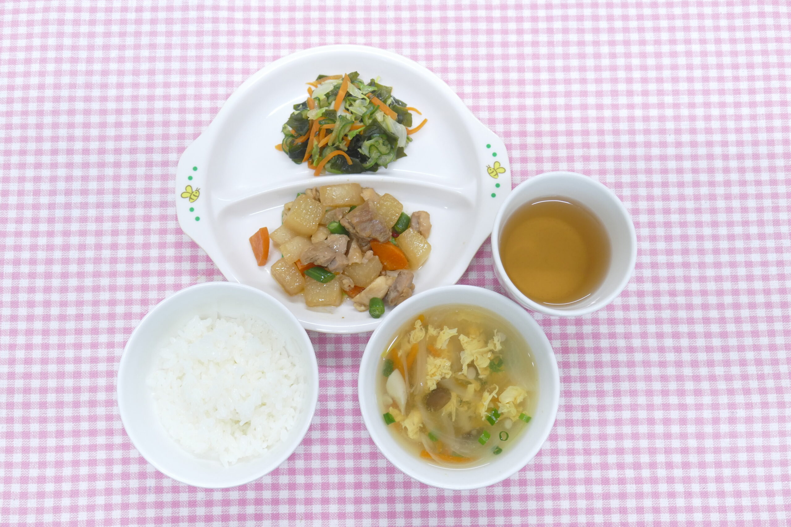 ≪お昼ごはん≫ 豚肉と根菜の煮物 きゃべつのミモザサラダ わかめとエノキのみそ汁 ごはん ≪おやつ≫ ころころドーナツ 牛乳