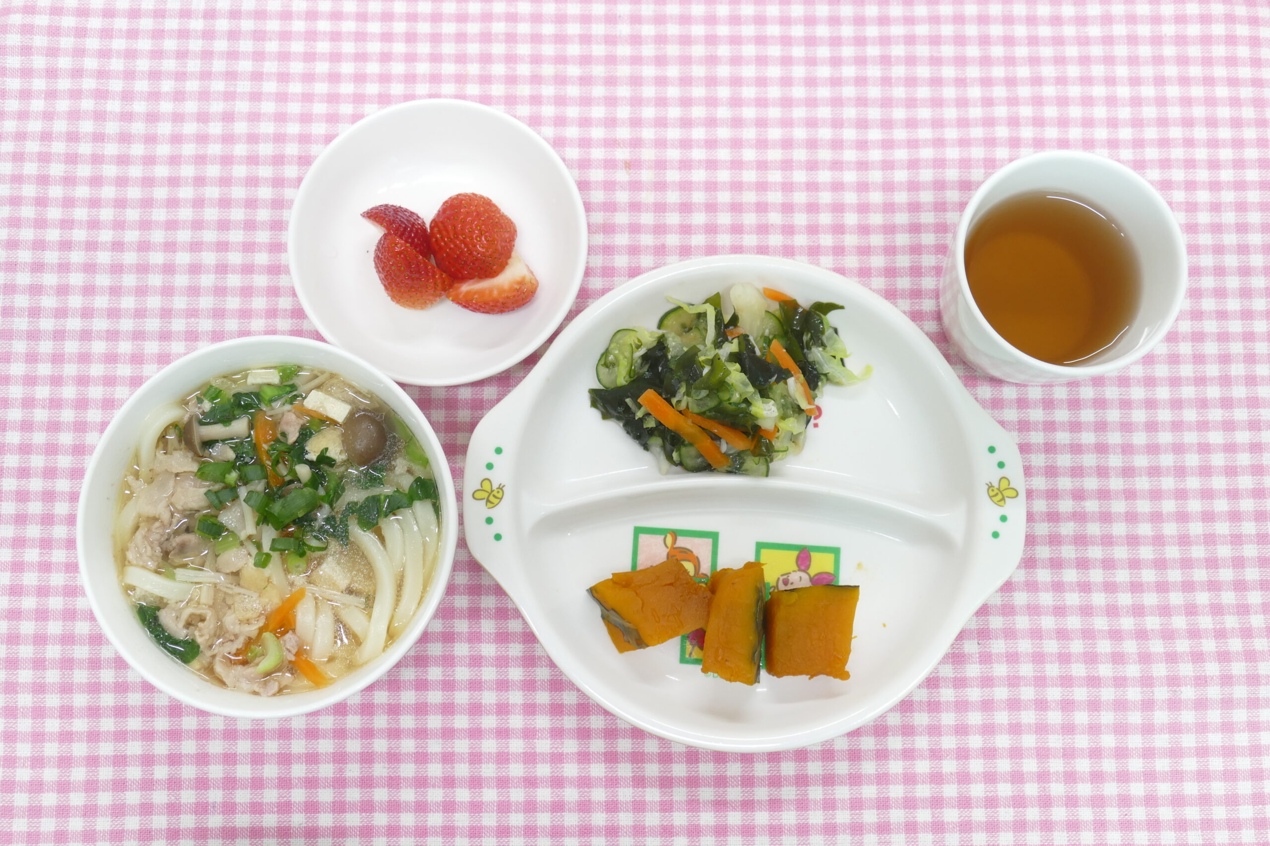 ≪お昼ごはん≫ きのこうどん わかめとしらすの酢の物 かぼちゃの甘煮 フルーツ(苺)※今日,園児達で収穫しました🍓 ≪おやつ≫ ツナサンド 牛乳
