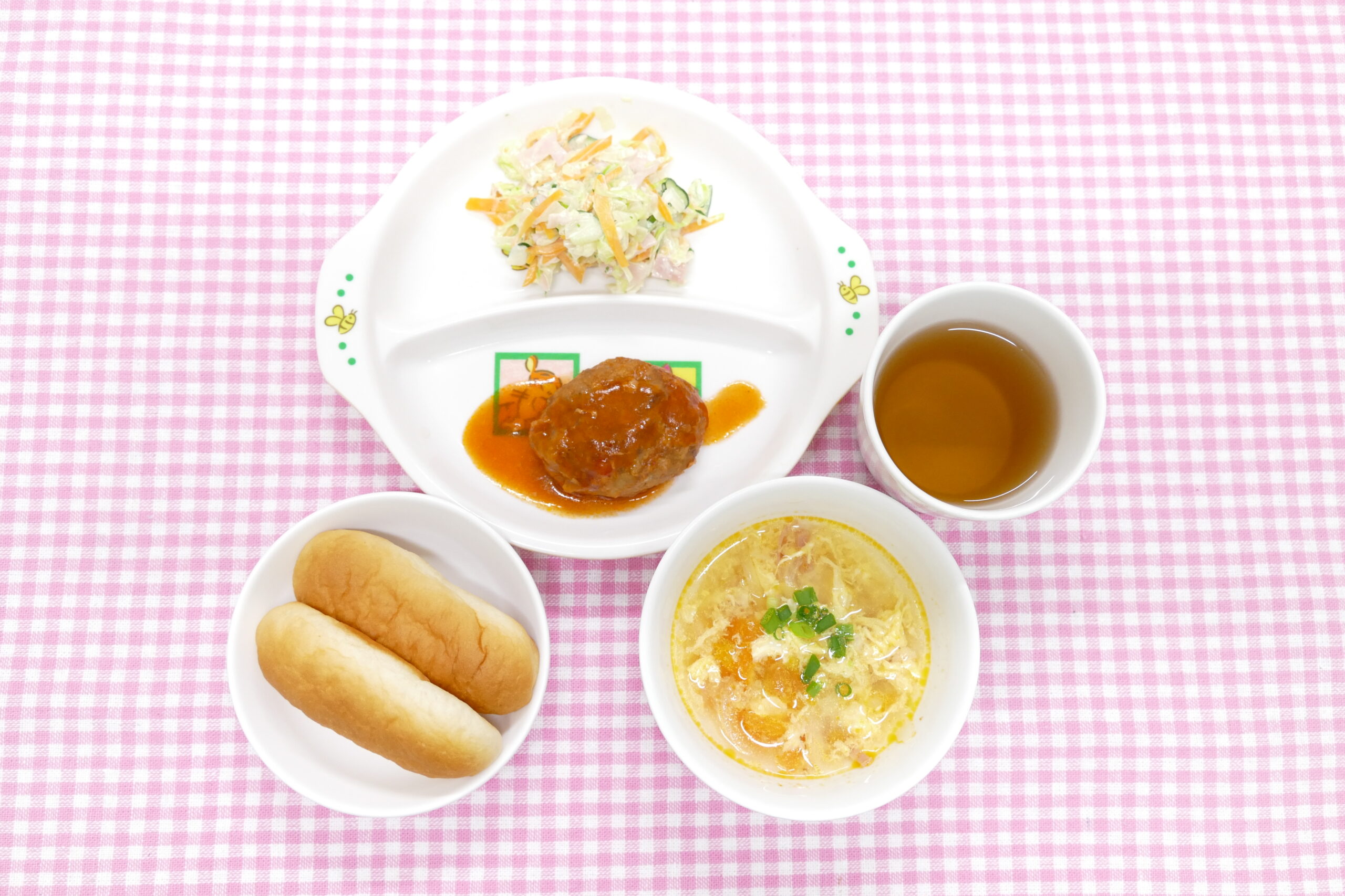 ≪お昼ごはん≫ 煮込みハンバーグ 野菜サラダ トマトと卵のスープ ロールパン ≪おやつ≫ フルーツヨーグルト 牛乳